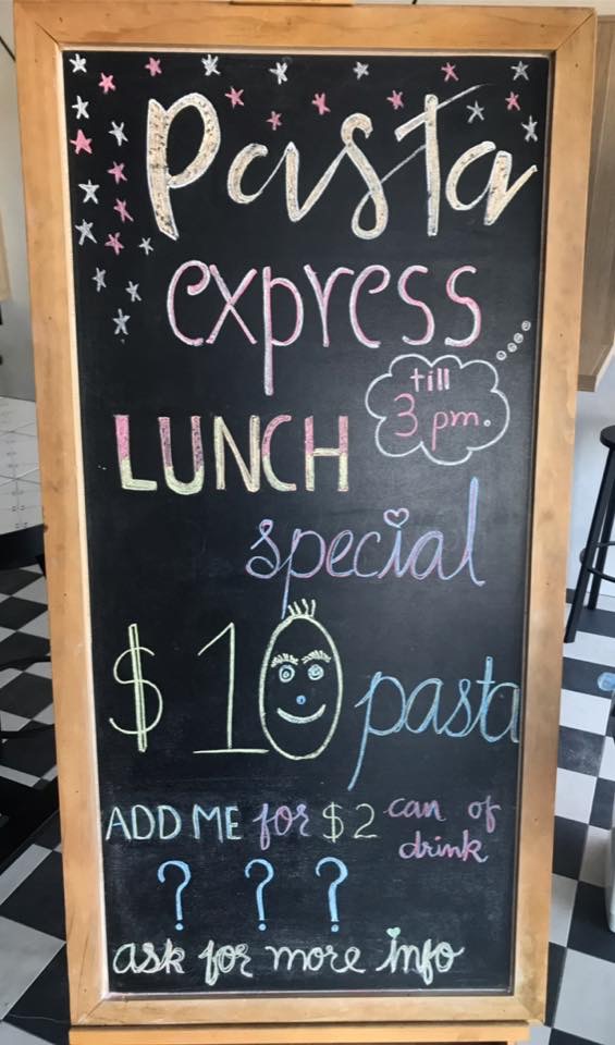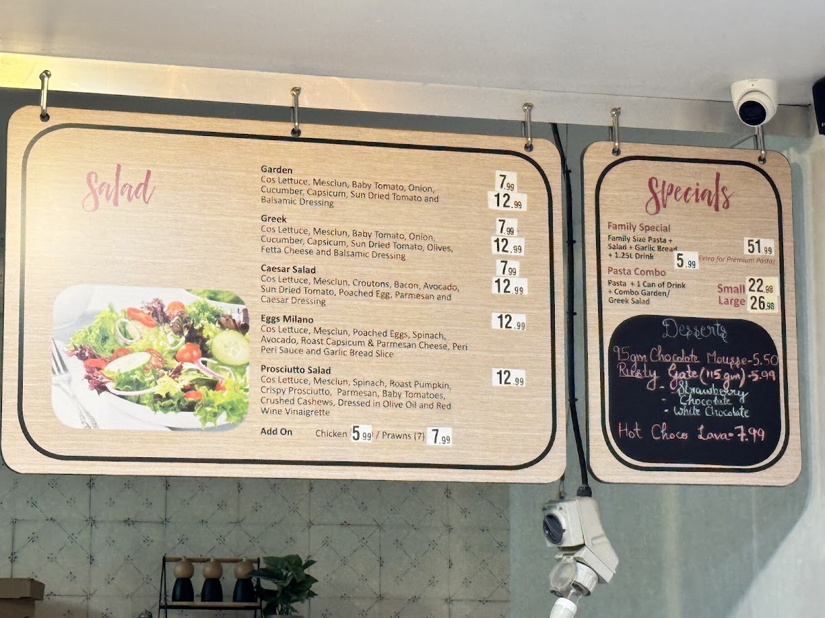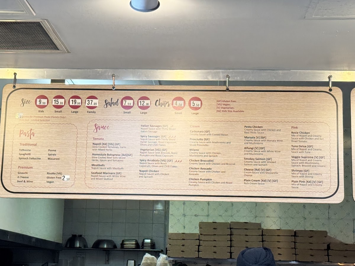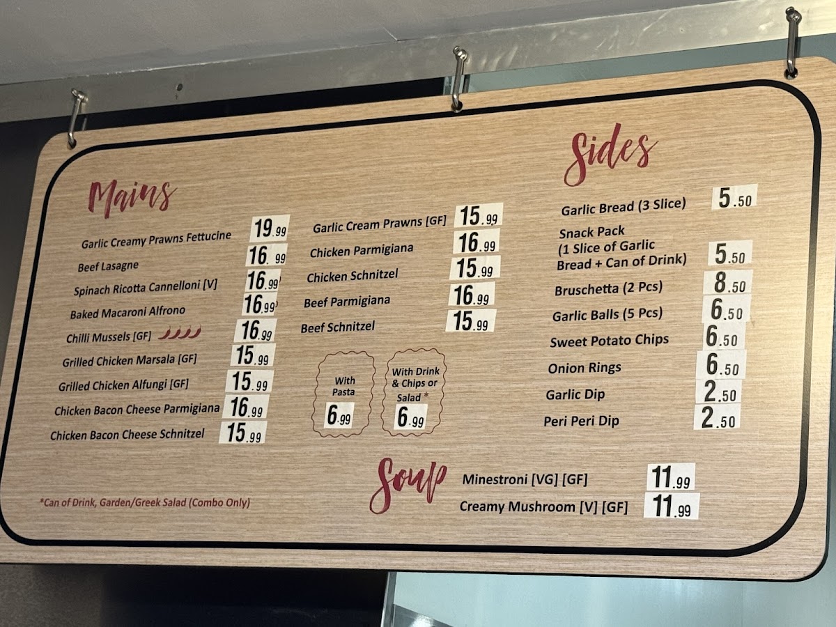Pasta Express offers a diverse and tantalizing menu that caters to various tastes and dietary preferences. For sides, diners can enjoy Sea Salt & Cracked Pepper Squid or Prawn Twisters, perfect for those craving something light yet flavorful. The kids' menu features several gluten-free options like the Kids Plain Pink Pasta (GF) and Kids Homestyle Bolognese Pasta (GF). For dessert, the choices are delightful, including 115gm Chocolate Mousse, Strawberry Mousse, and Mango Sago Pudding. The mains section showcases hearty options such as Beef Schnitzel, Chicken Parmigiana with Pasta, and Beef Lasagne with Pasta, all complemented by flavorful pasta dishes like Cheese Pasta (GF) and Spicy Arrabiata Pasta (GF). Salads, including the Eggs Milano Salad and Greek Salad, provide refreshing options, while hot treats like Choco Lava satisfy dessert lovers. For those in the mood for soup, the Minestrone Soup and Creamy Mushroom Soup are comforting choices. The family pasta options, like the Carbonara Family Pasta and Seafood Marinara Family Pasta, offer generous portions for sharing. With drinks ranging from Gatorade to Spring Valley Juice, and loaded fries like Fries with Bolognese Sauce, Pasta Express’s menu ensures there's something for everyone to enjoy.