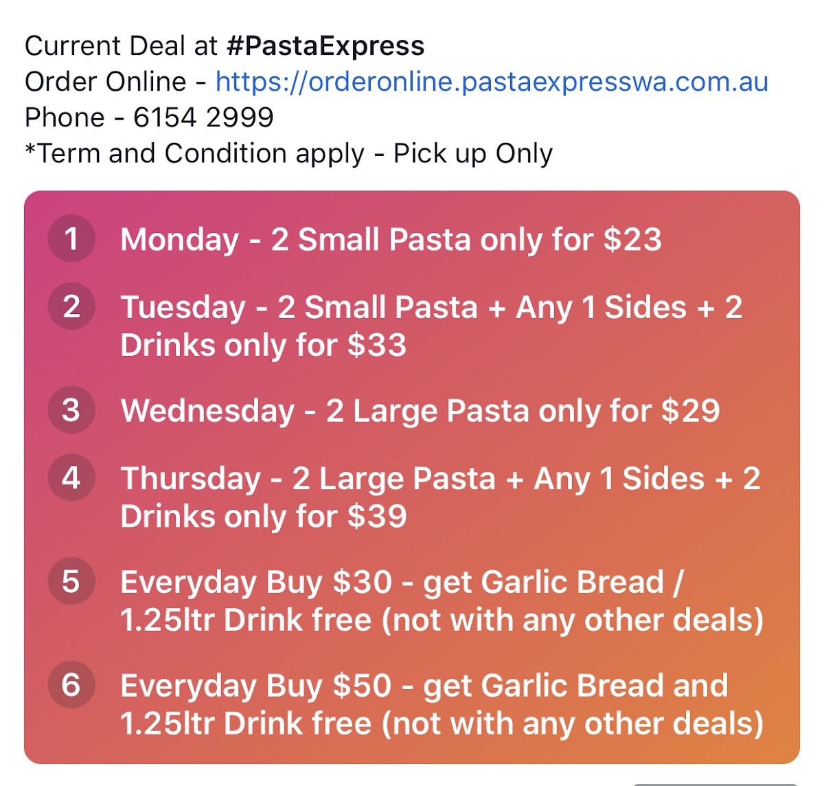 Stir-fried prawns with garlic, and mixed with rich cream sauce and fettuccine pasta. Optional serve with choice of pasta and sauce, chips and drink or salas and drink.